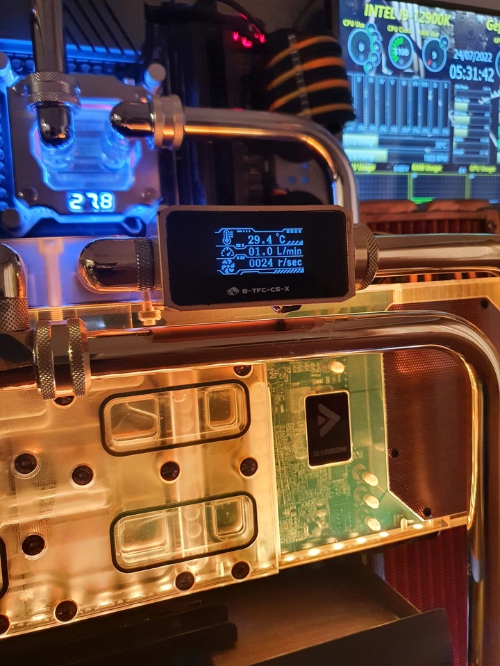 The graphic card water block has been specially modified showing gold as well as the GPU water pump and reservoir.