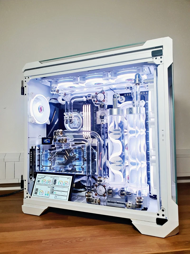 With our custom watercooled PCs you will enjoy customising all the RGB light as your preference and the quietness of the fans in use of low performance such as document work or watching videos (full spinning in gaming).